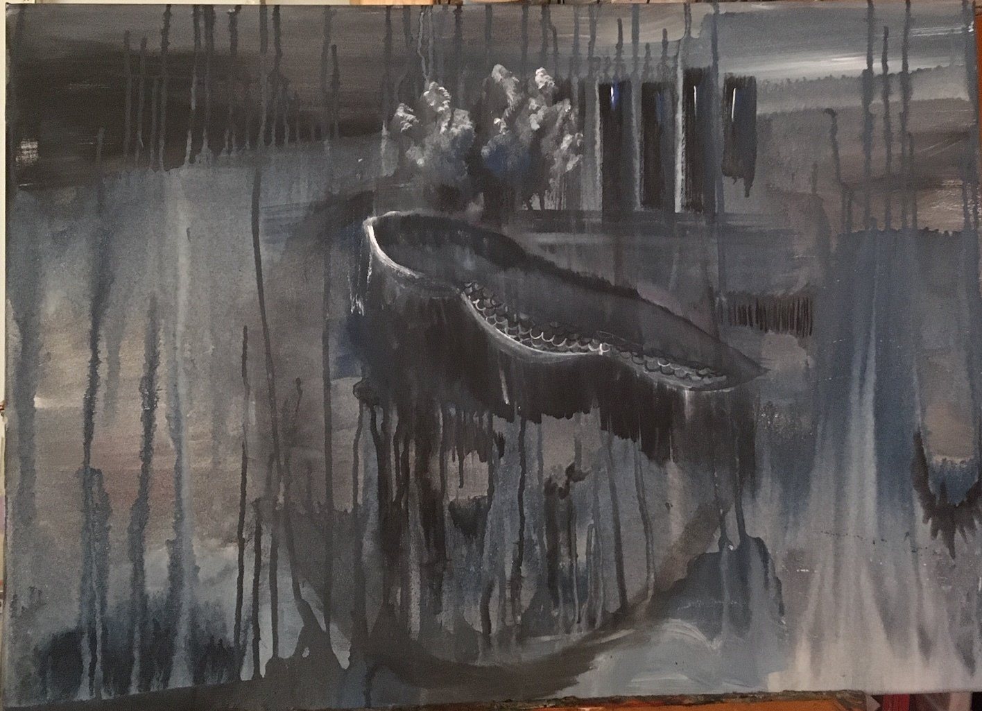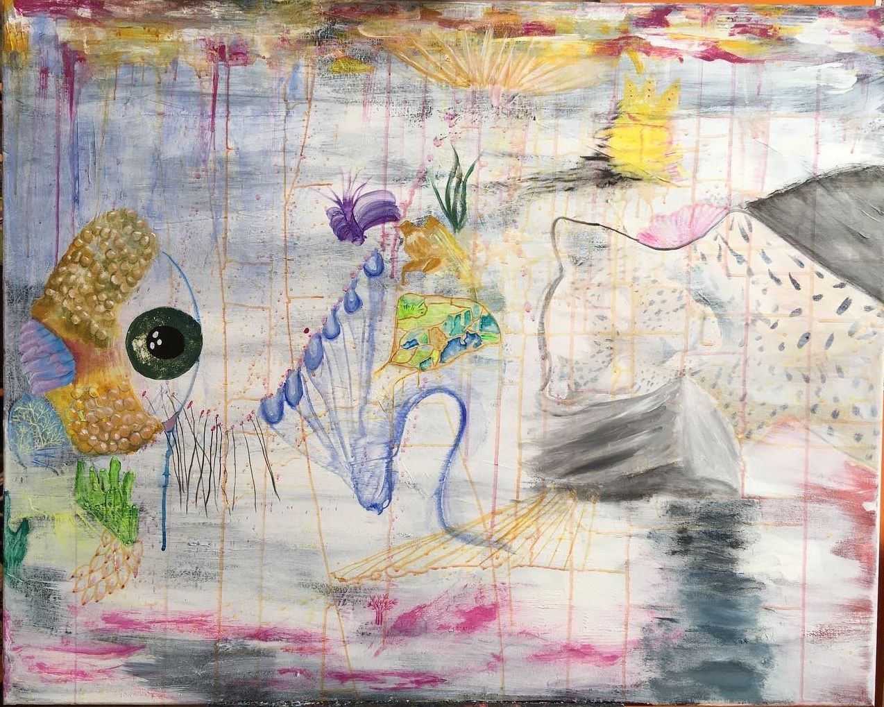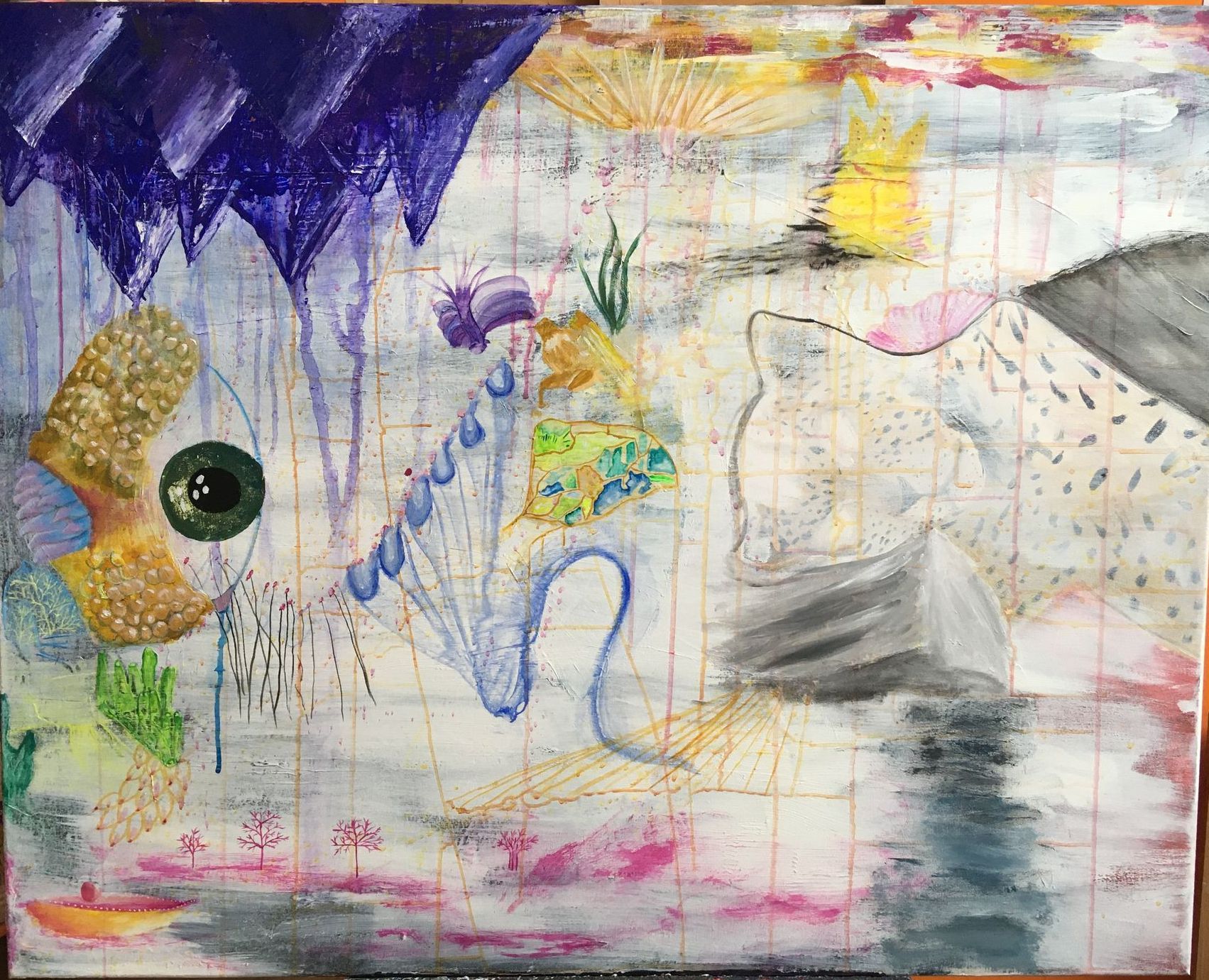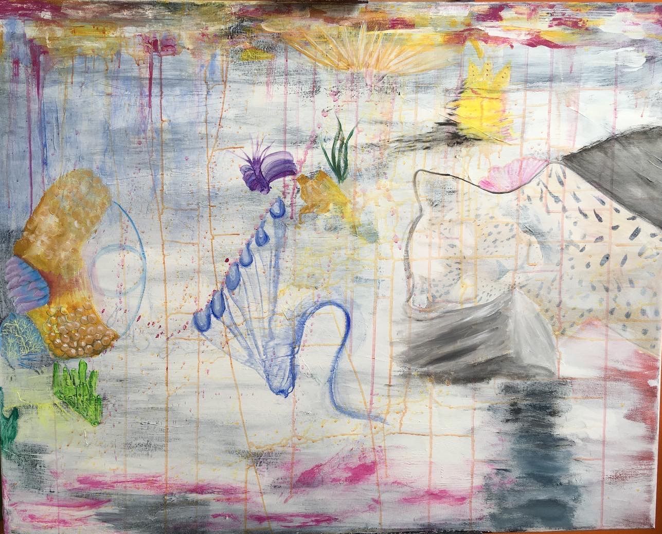 I made this work when my life was once again shrouded in darkness. I had been rejected by a person I was in love with and I didn't understand it. In order to focus on something other than the pain, I started painting. I only saw black in front of me and I started with that color. Gradually I saw an image in the darkness which I tried to bring to the surface more and more. I accentuated the lines by adding different colors and white. It seemed as if the light was trying to get through and was even refracted, causing it to fall out in all different colors. In the end it looks like a fish, which is held with thin wires to prevent it from falling into prickly water plants.