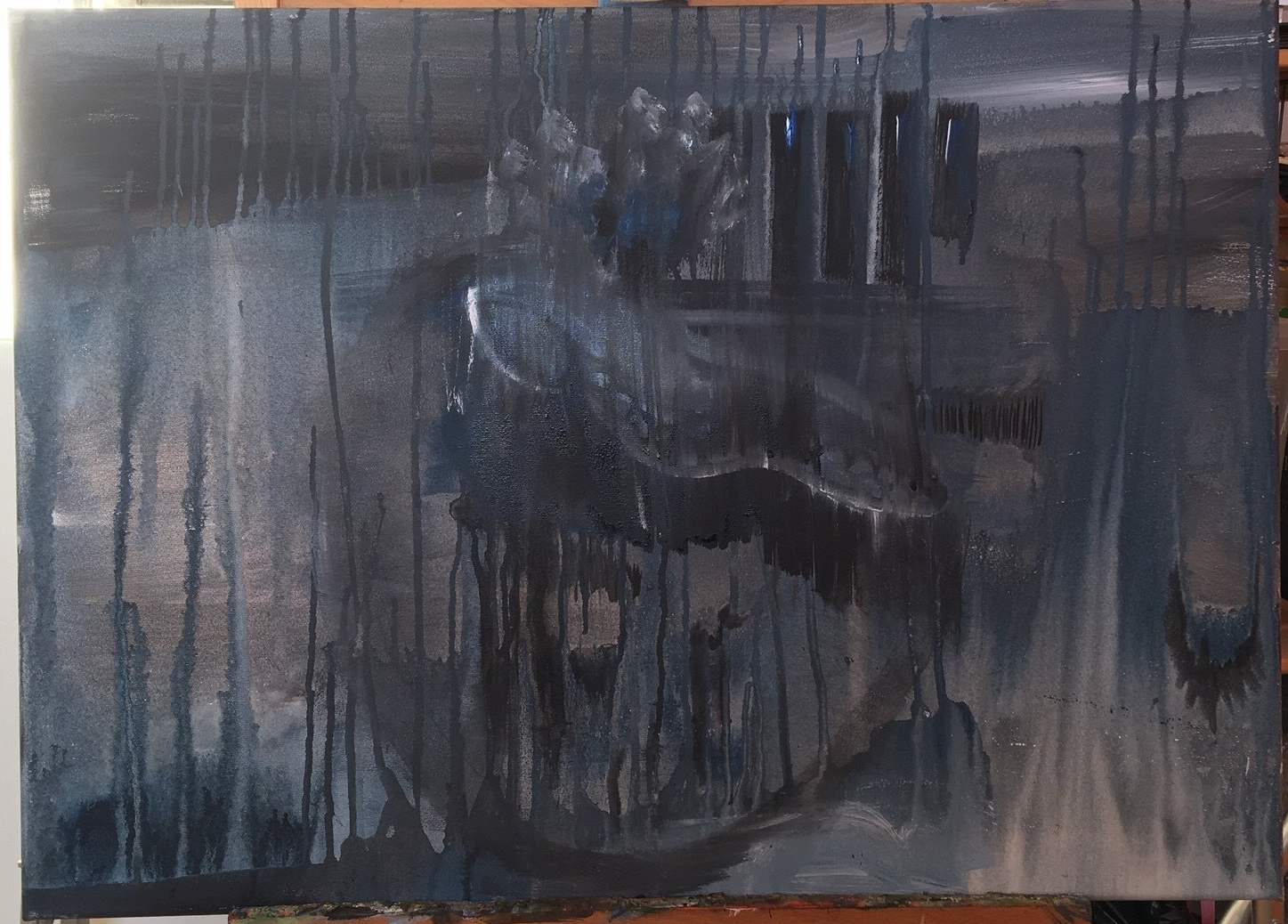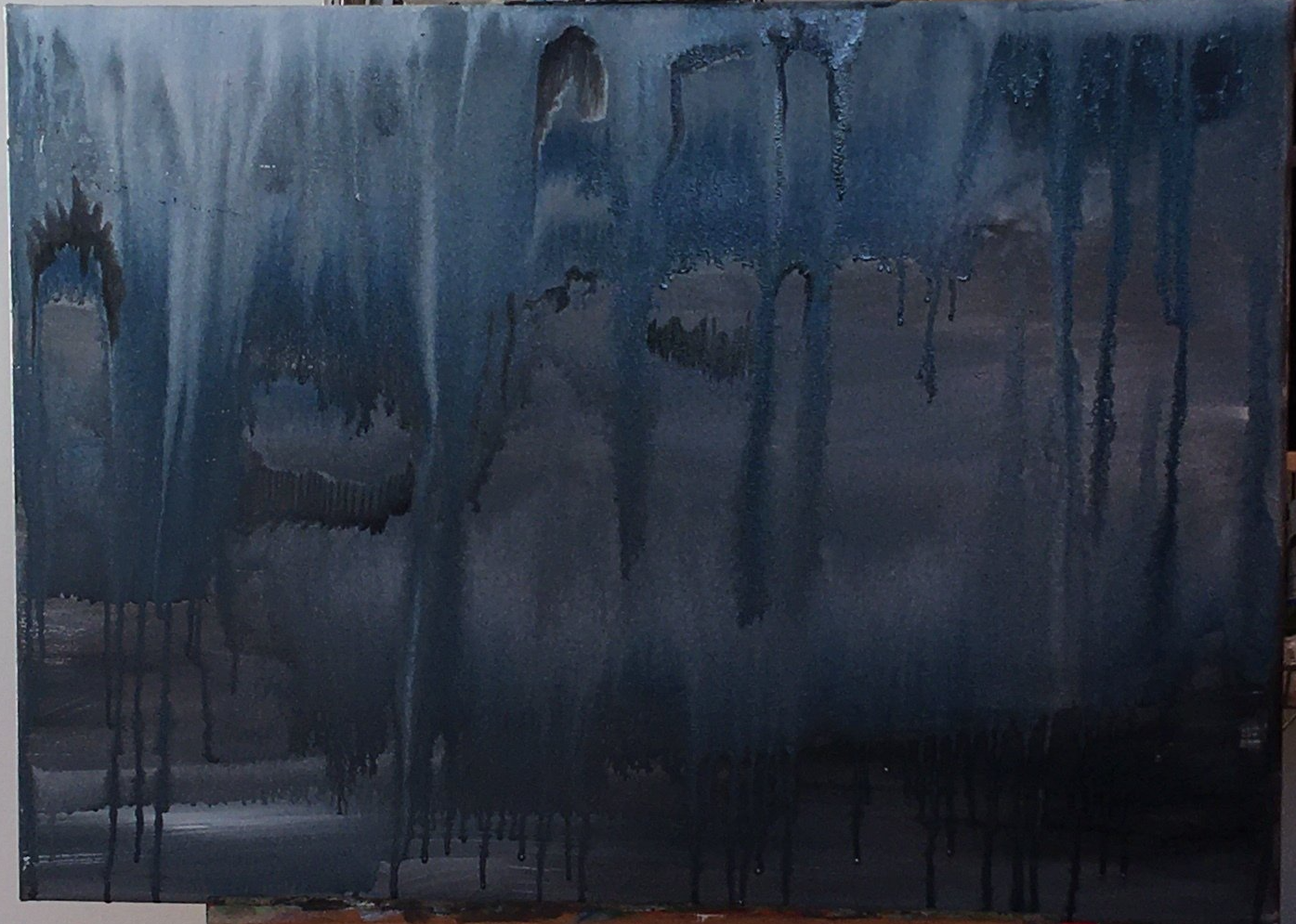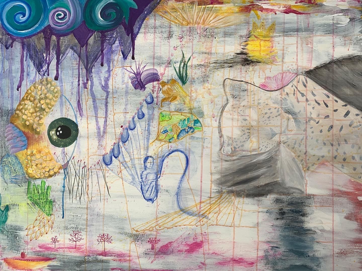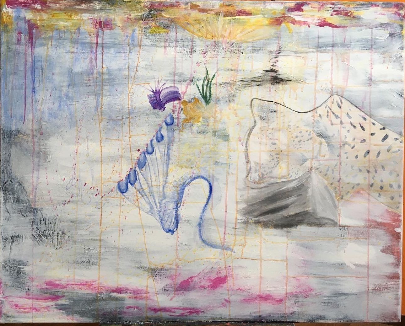The work is called 'Hold me', because at that moment I wanted nothing more than the human need to hold someone. The water in this work represents the emotions I was swimming in. The thin threads are like my painting supplies, holding me and preventing me from falling.