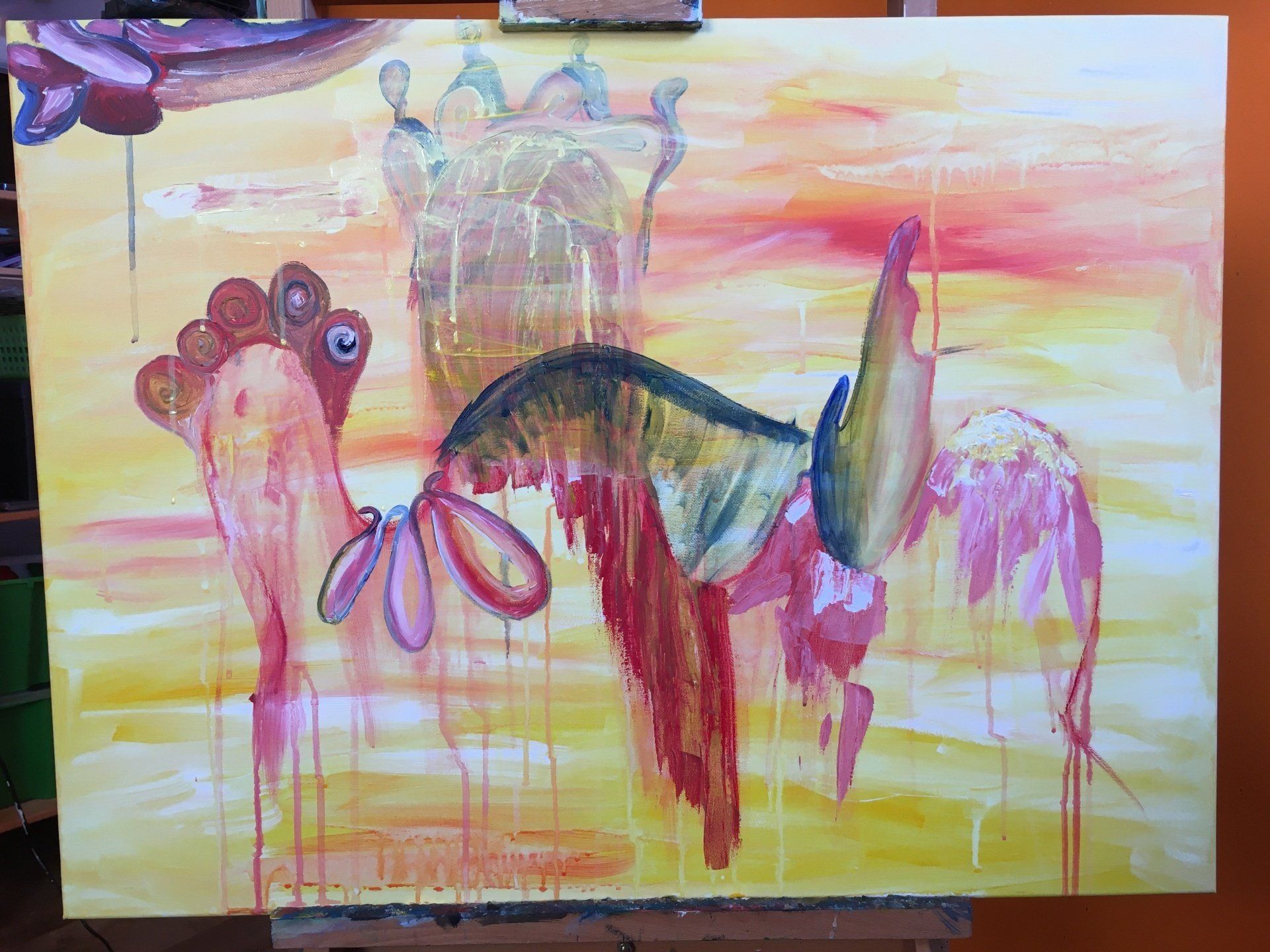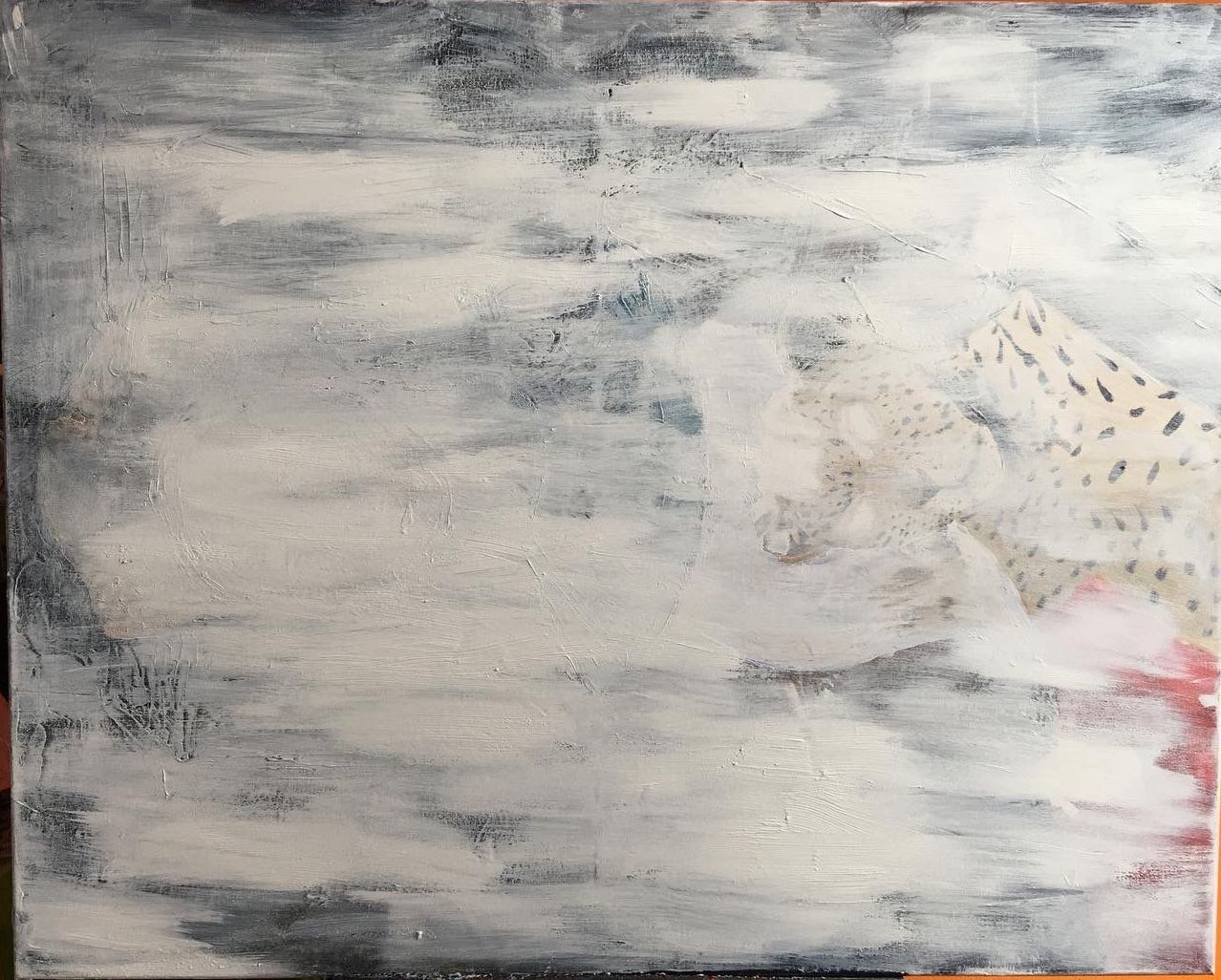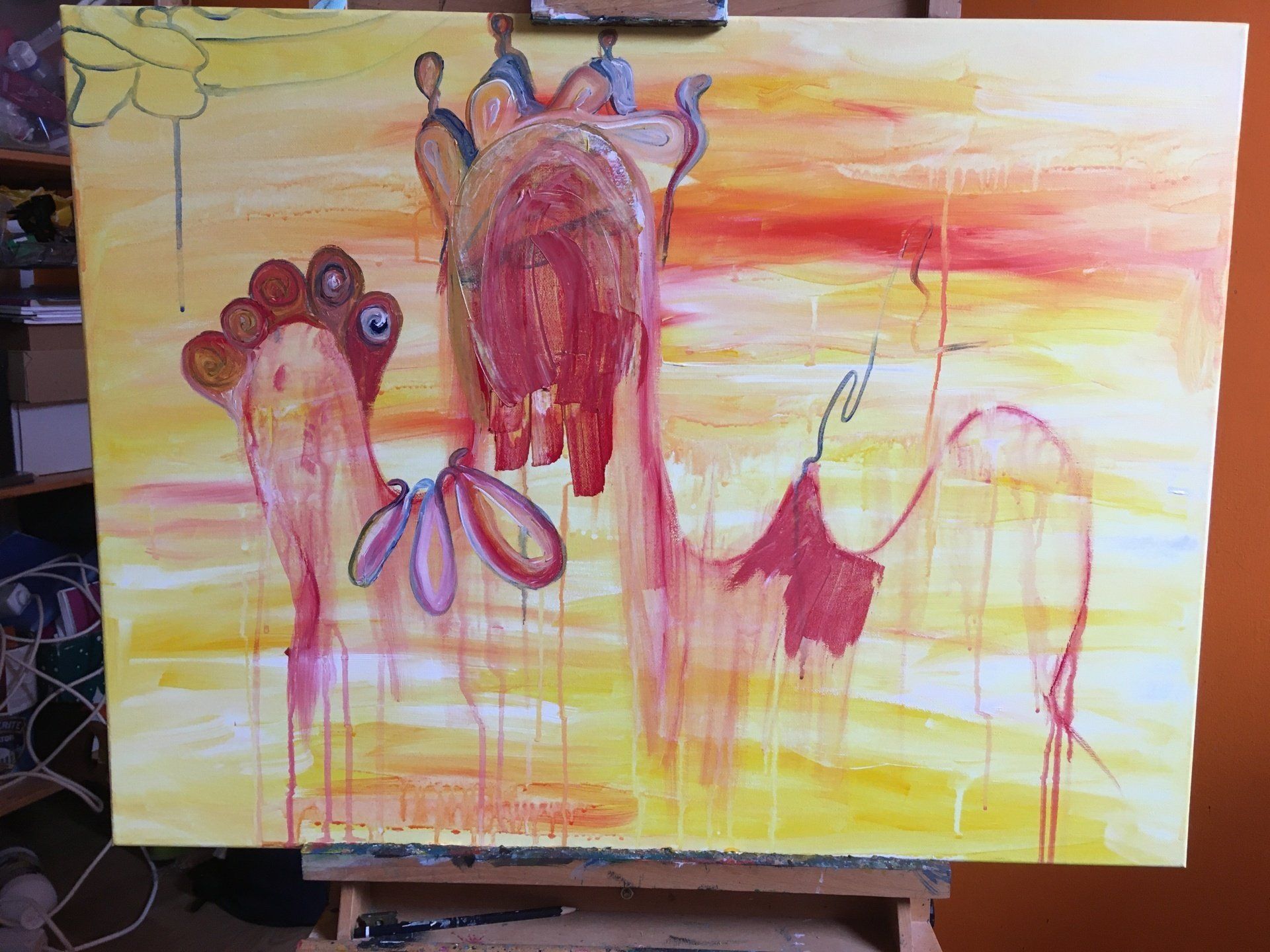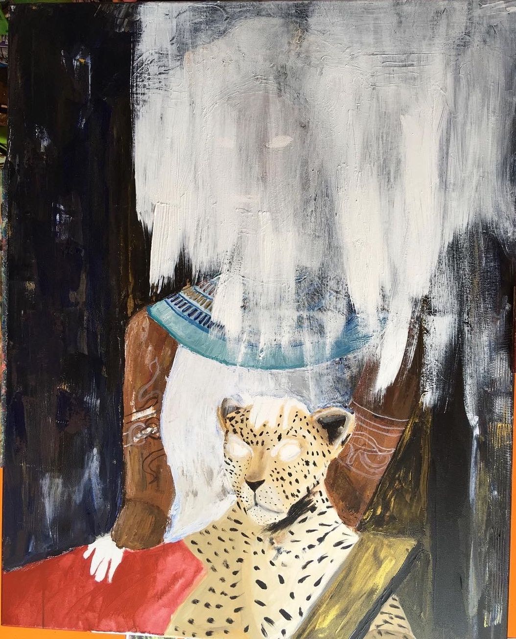 When I was still painting realistically, I once started with an Egyptian empress, sitting on her throne with her leopard on her lap. I never finished this work. Years later, in 2020, I picked up this painting again. The empress looked at me and I couldn't stand her face anymore. I immediately painted over it and decided to make something else out of it.