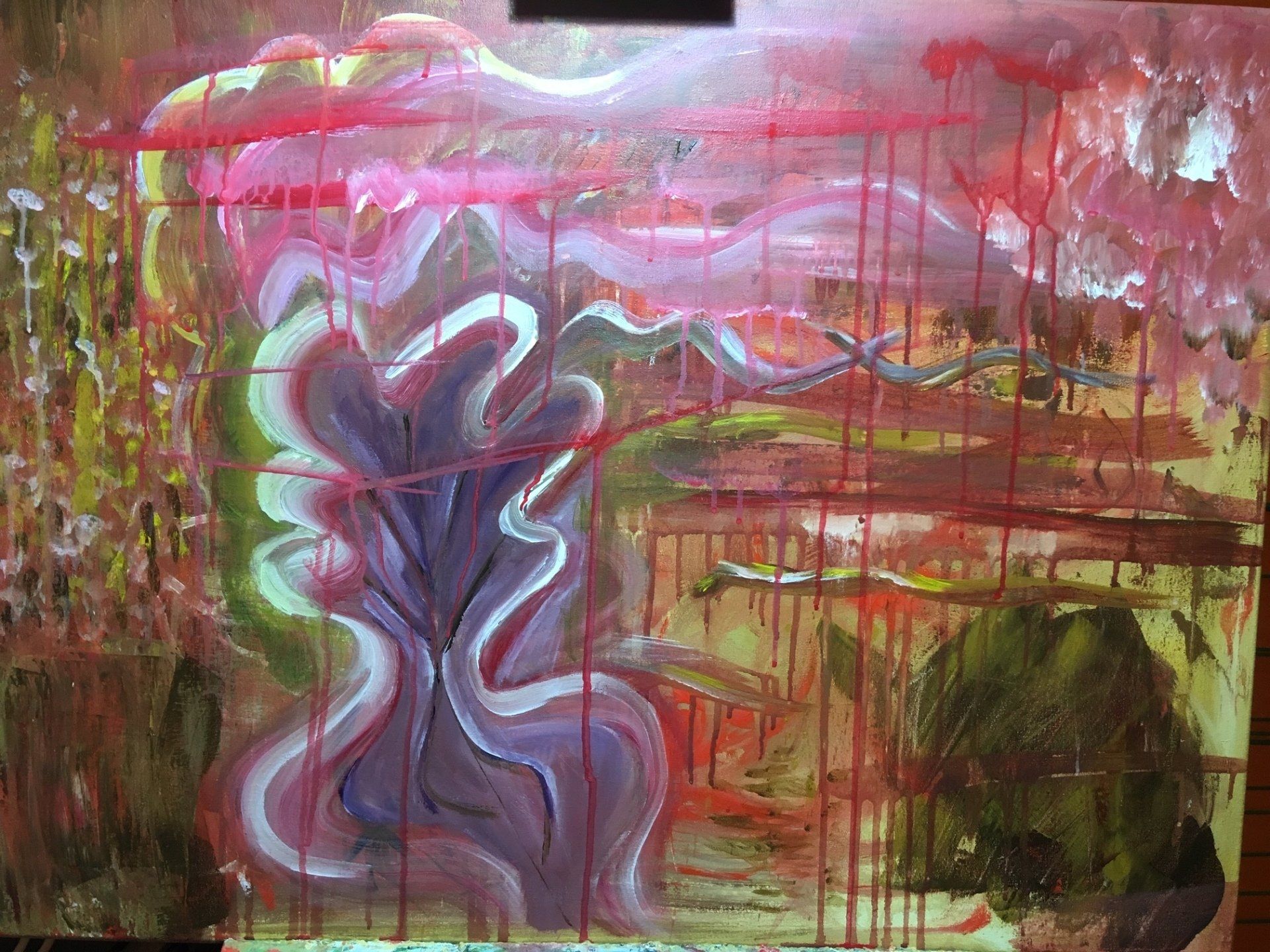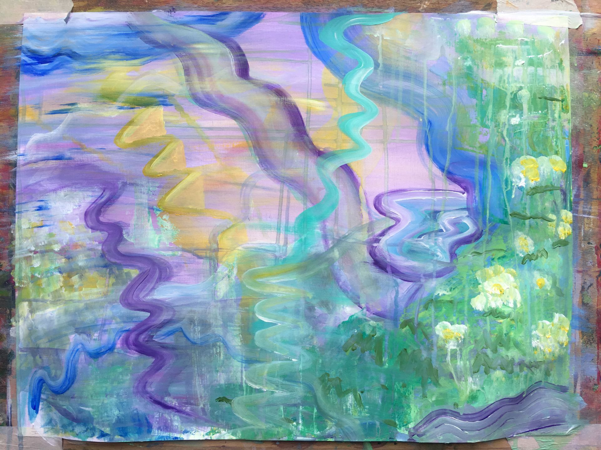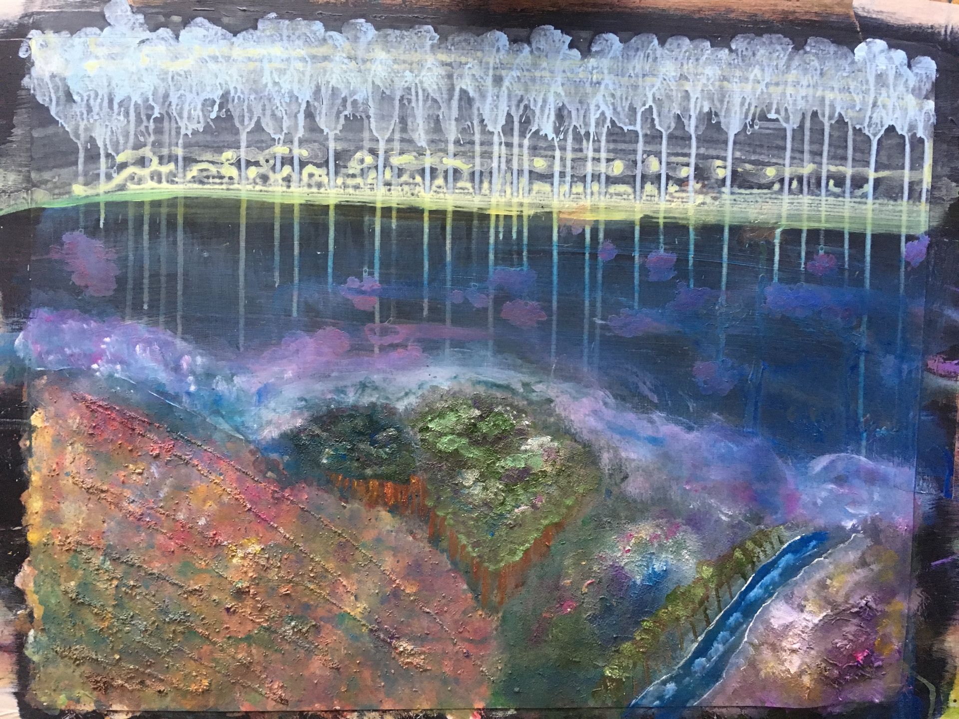 I made this painting in one day during my Vedic Art course. I used to paint mostly realistic scenes and wanted to learn to let go of the rules. My brush strokes and lines were still very stiff in the beginning. I found free painting quite difficult and I was still searching during the process. While I was working I started to become more aware of my desires. I wanted texture and glued some sand on the bottom left. I thought of the Tuscan countryside and started to paint this. The moment felt magical, which was expressed with the purple and dark blue colors. Eventually I took a brush, diluted the paint with water and dabbed it above the landscape. The watery paint dripped down. To prevent this from running further I laid the painting flat. I enjoyed this so much and while I looked at the work I thought: 'This feels liberating, I want to keep doing this'. I made a representation of my inner world and captured a dream, hence the name 'Dreamday'.