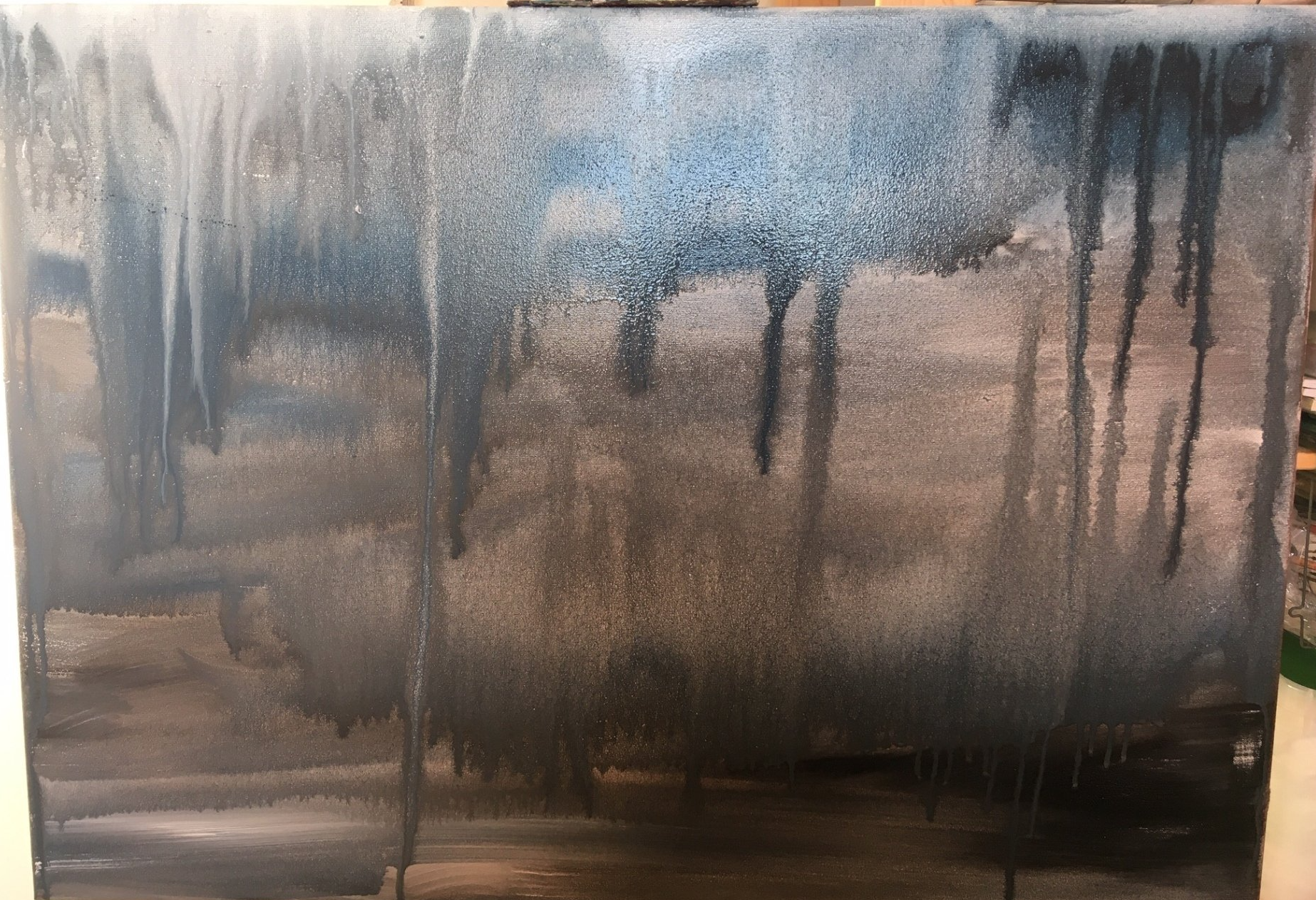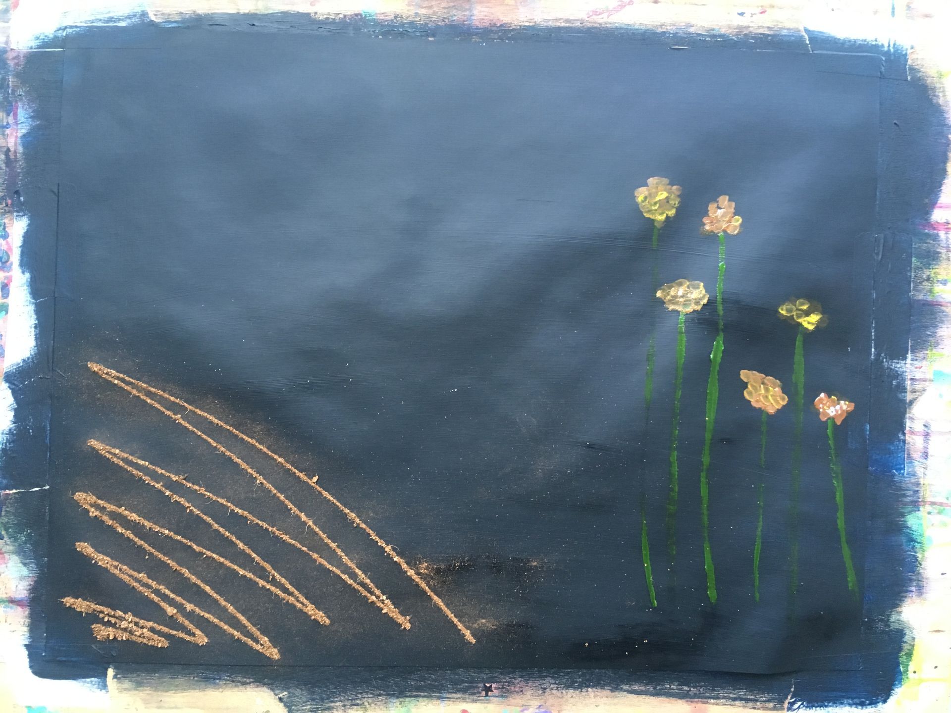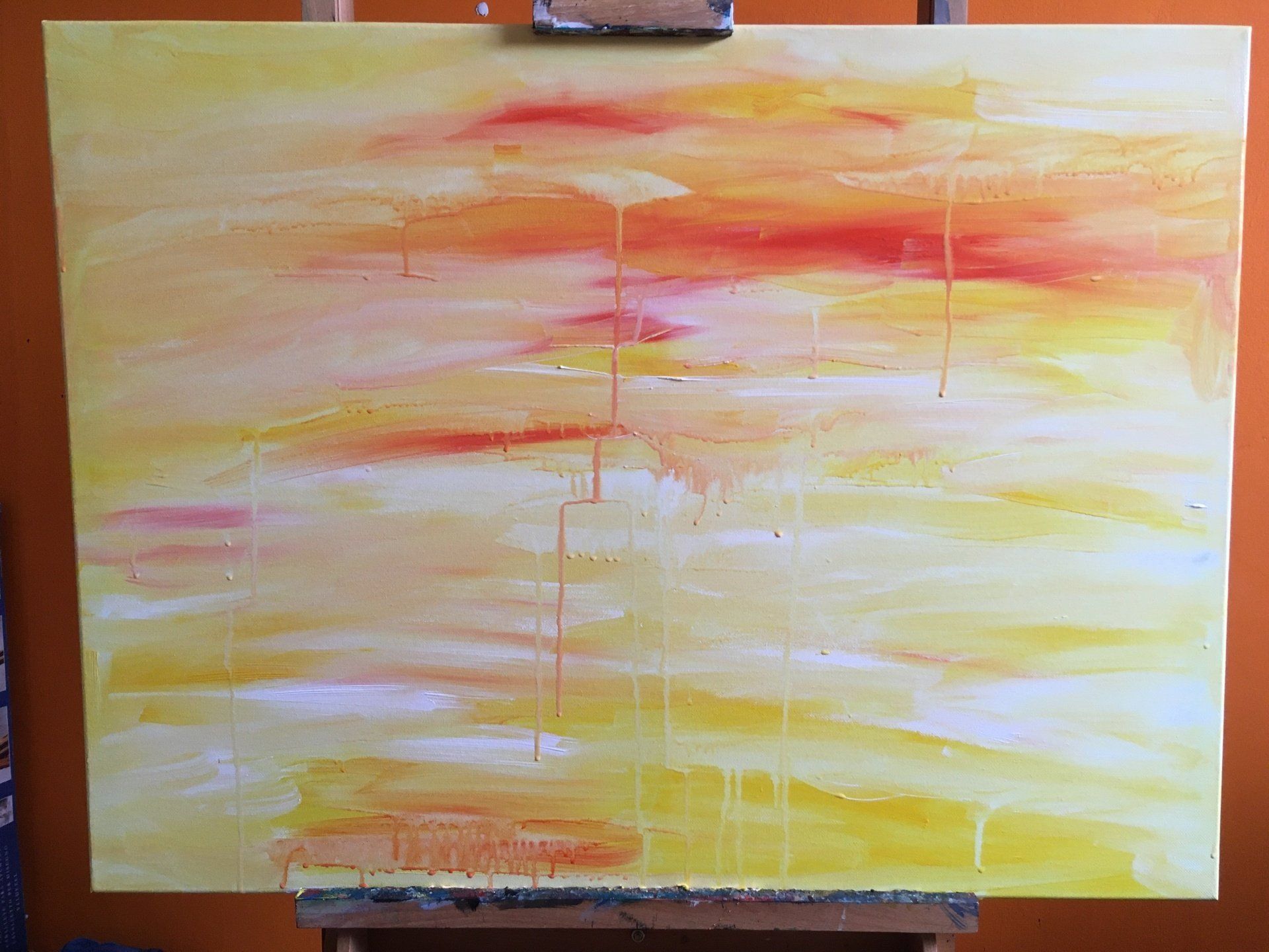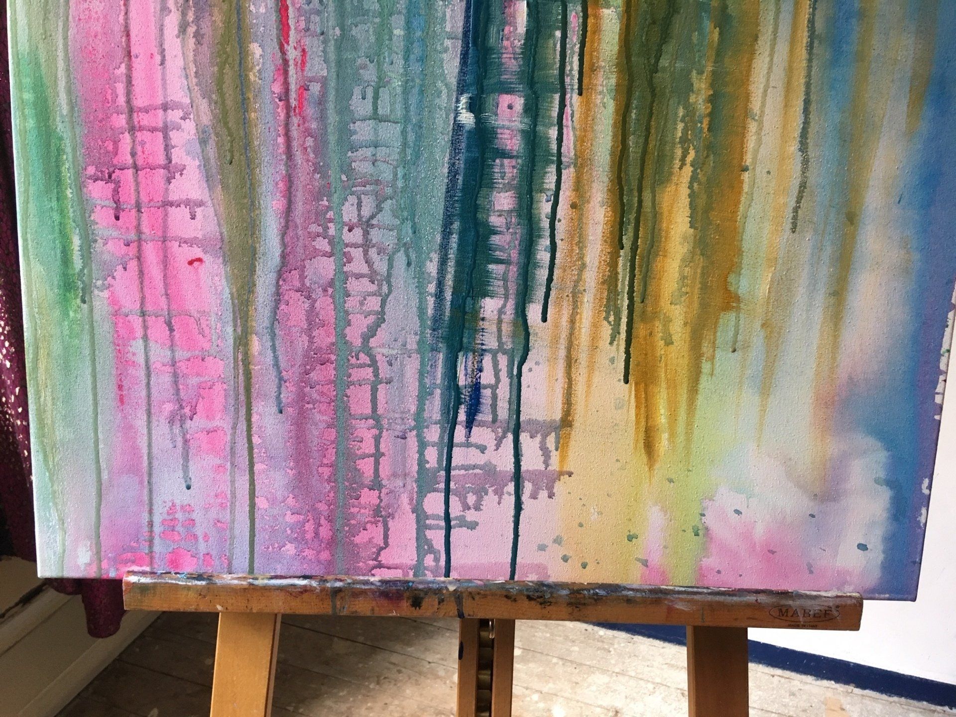 I made this painting in one day during my Vedic Art course. I used to paint mostly realistic scenes and wanted to learn to let go of the rules. My brush strokes and lines were still very stiff in the beginning. I found free painting quite difficult and I was still searching during the process. While I was working I started to become more aware of my desires. I wanted texture and glued some sand on the bottom left. I thought of the Tuscan countryside and started to paint this. The moment felt magical, which was expressed with the purple and dark blue colors. Eventually I took a brush, diluted the paint with water and dabbed it above the landscape. The watery paint dripped down. To prevent this from running further I laid the painting flat. I enjoyed this so much and while I looked at the work I thought: 'This feels liberating, I want to keep doing this'. I made a representation of my inner world and captured a dream, hence the name 'Dreamday'.