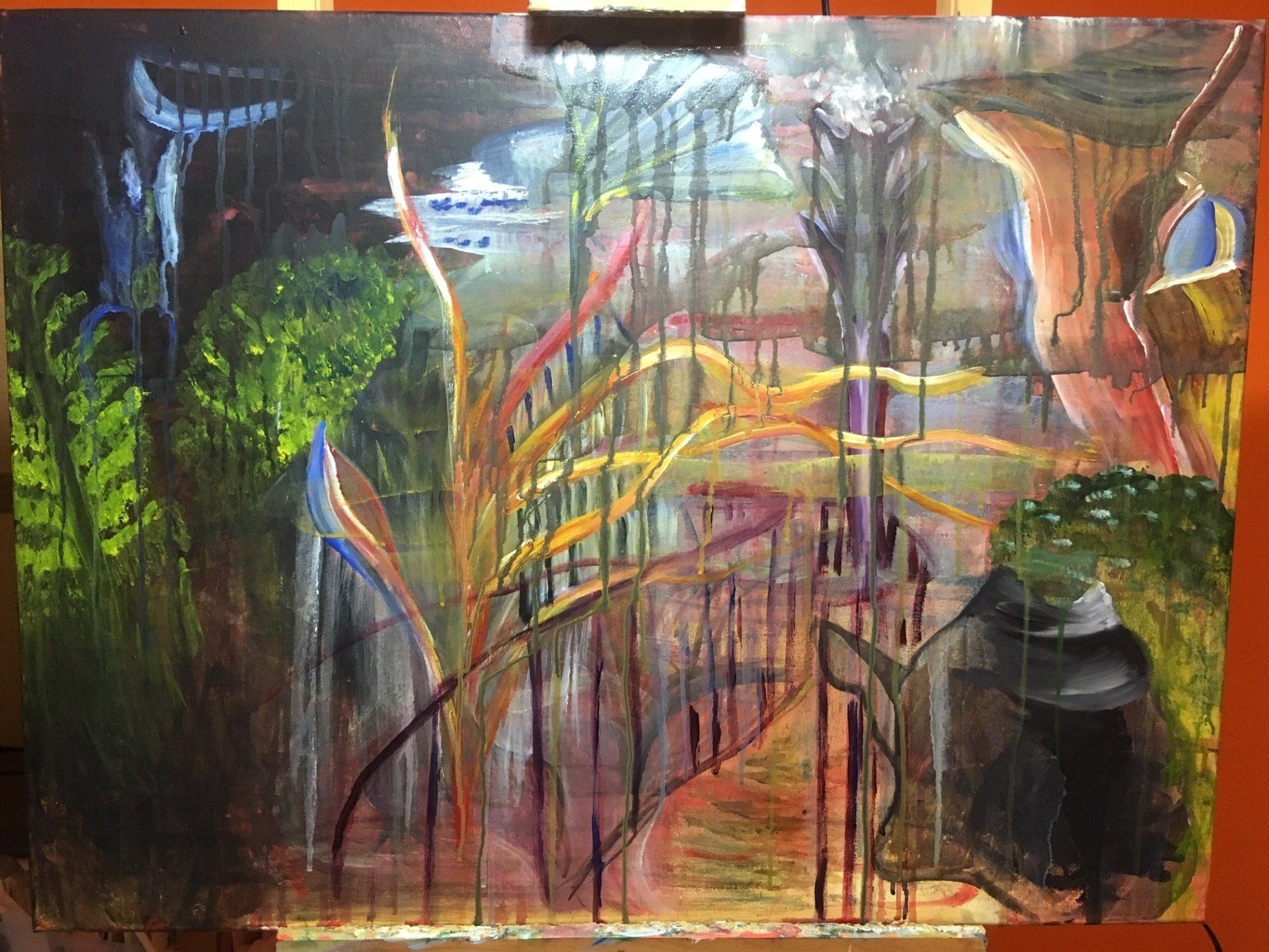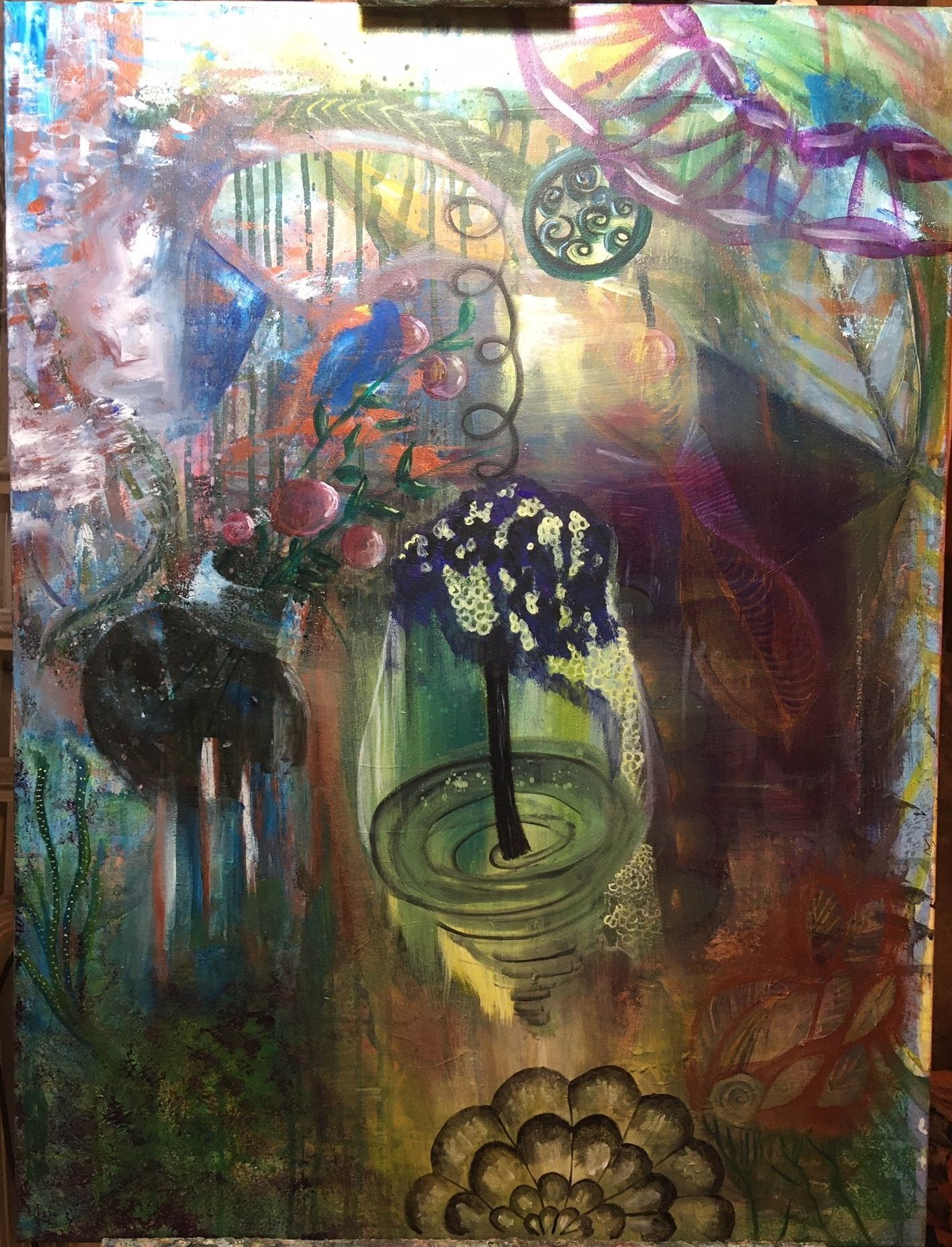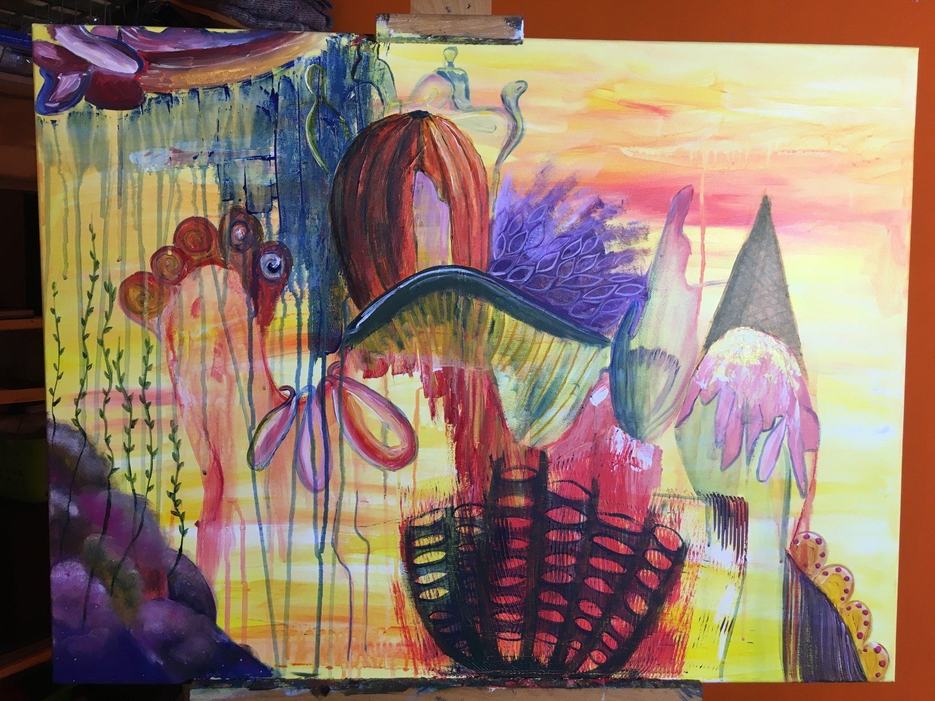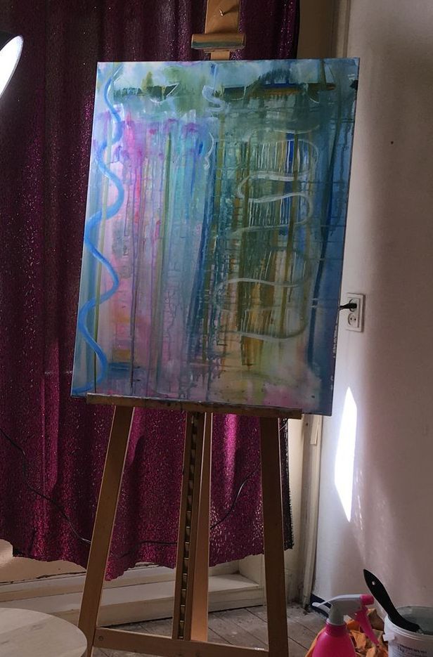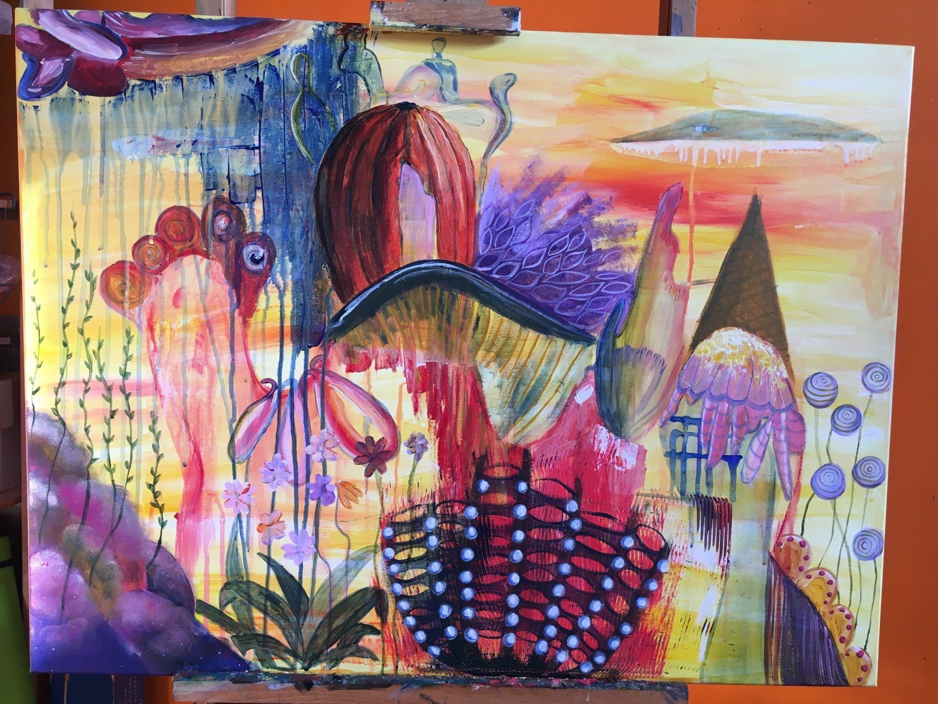 Unfortunately I didn't take many pictures of 'City Drone' during the process, because I notice that I have trouble getting out of my flow. City Drone is one of my first intuitively made paintings on canvas with a larger format. I started combining different techniques and forms. It was in a period of my life when I was looking for something new. I was curious, enthusiastic and especially experimenting a lot. When I finished the painting, it reminded me of a mysterious alien city, which is in harmony with nature. This can be seen in the mushrooms, bushes, leaves and shell-like shapes. I see an enormous richness in this mysterious landscape and for the first time I discovered my own depth.
