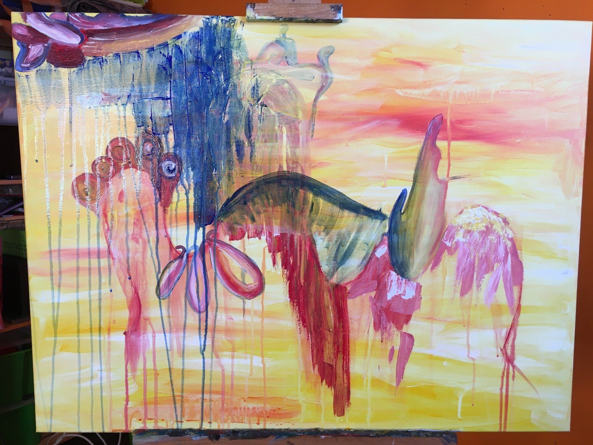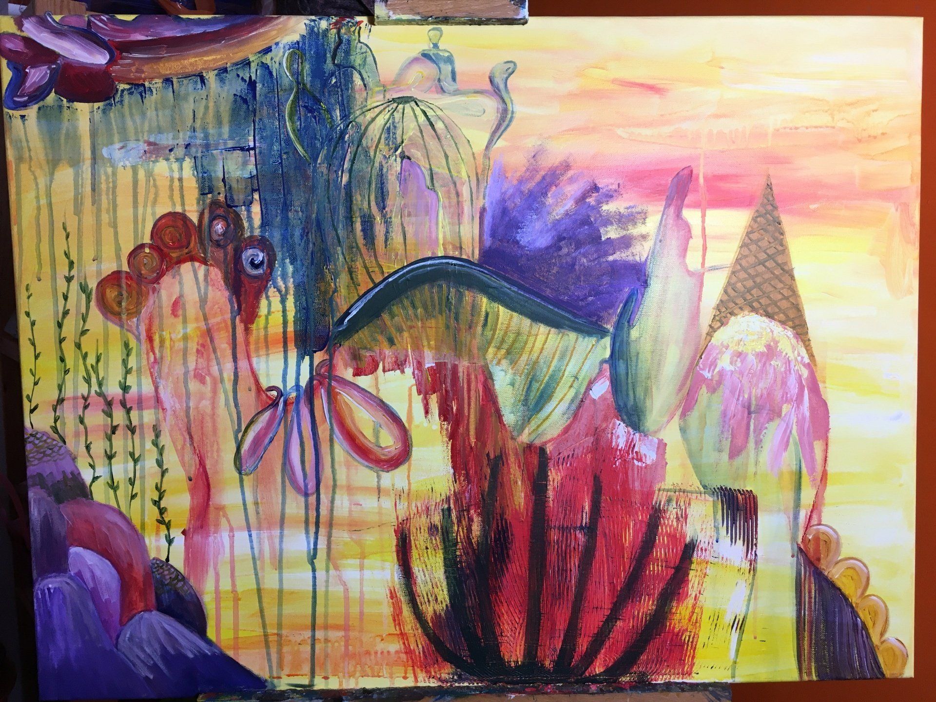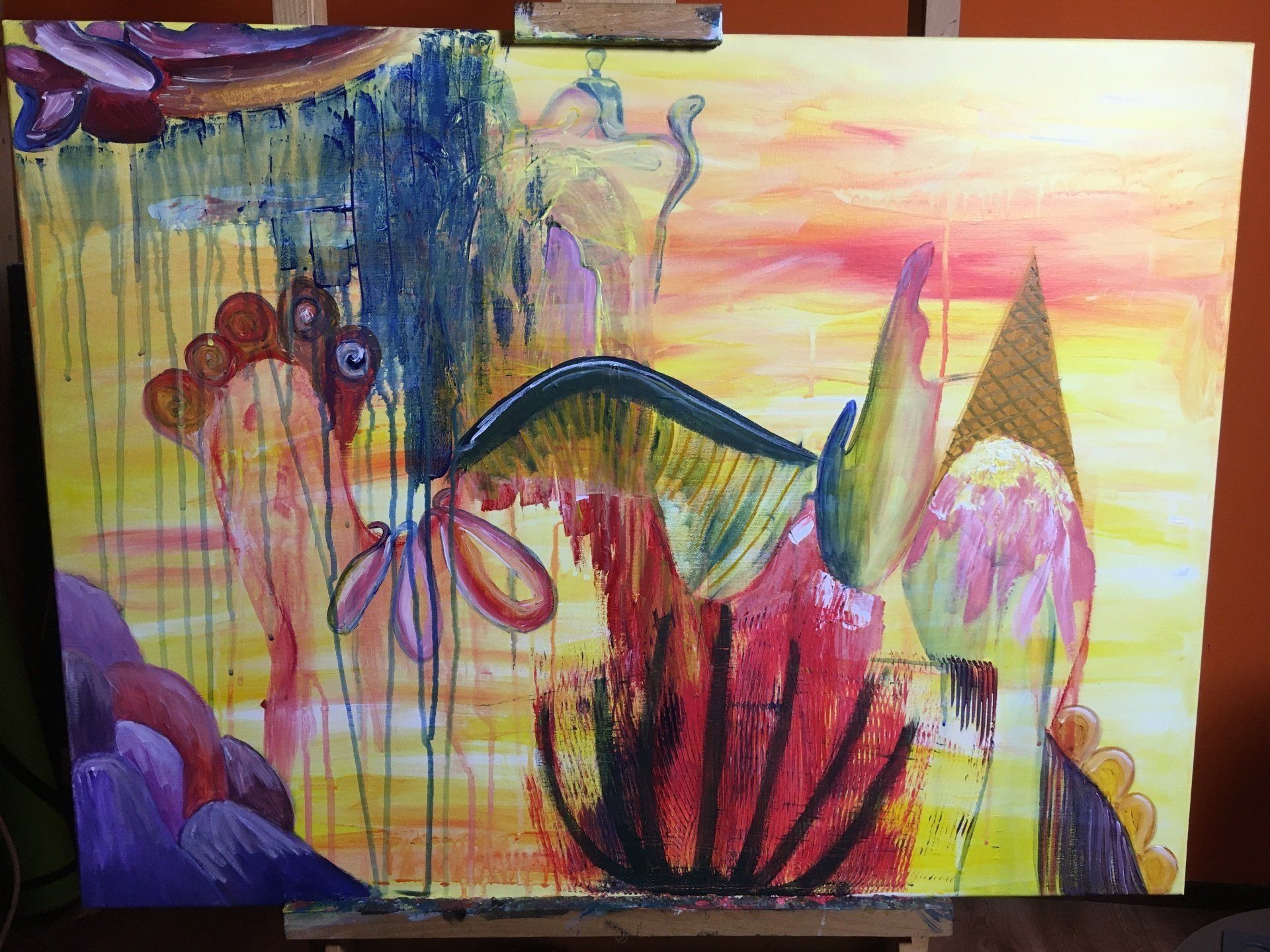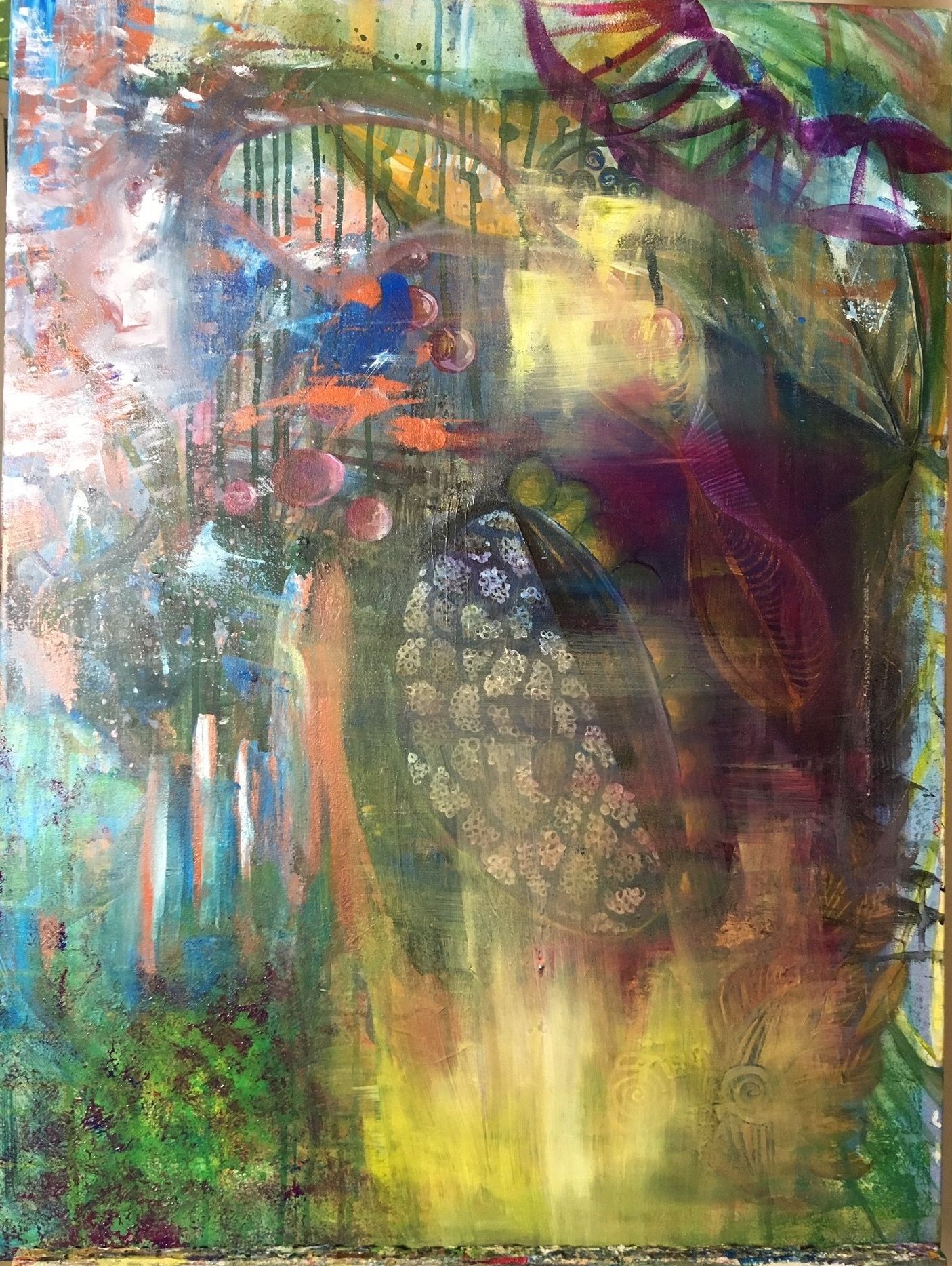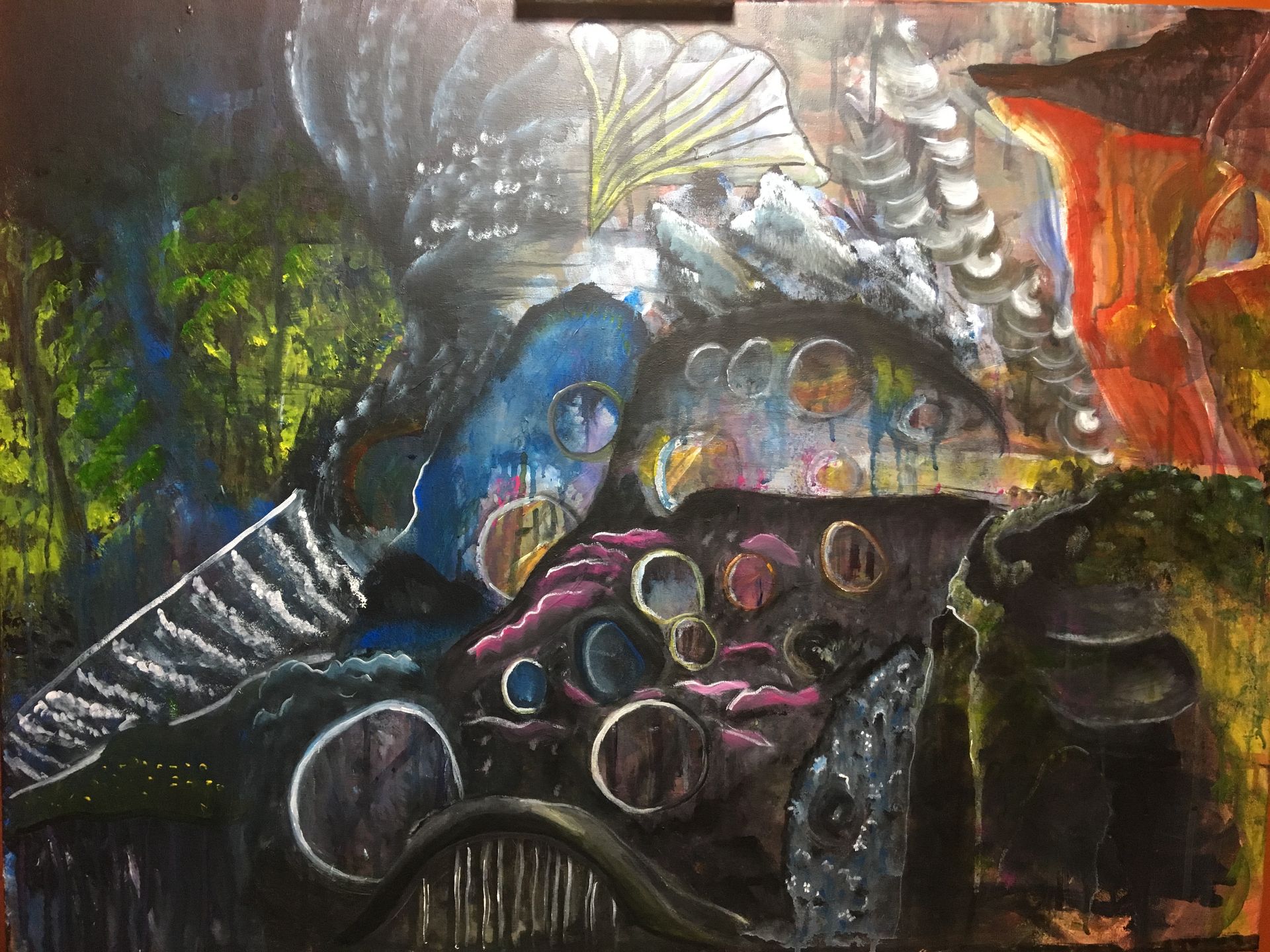 Unfortunately I didn't take many pictures of 'City Drone' during the process, because I notice that I have trouble getting out of my flow. City Drone is one of my first intuitively made paintings on canvas with a larger format. I started combining different techniques and forms. It was in a period of my life when I was looking for something new. I was curious, enthusiastic and especially experimenting a lot. When I finished the painting, it reminded me of a mysterious alien city, which is in harmony with nature. This can be seen in the mushrooms, bushes, leaves and shell-like shapes. I see an enormous richness in this mysterious landscape and for the first time I discovered my own depth.