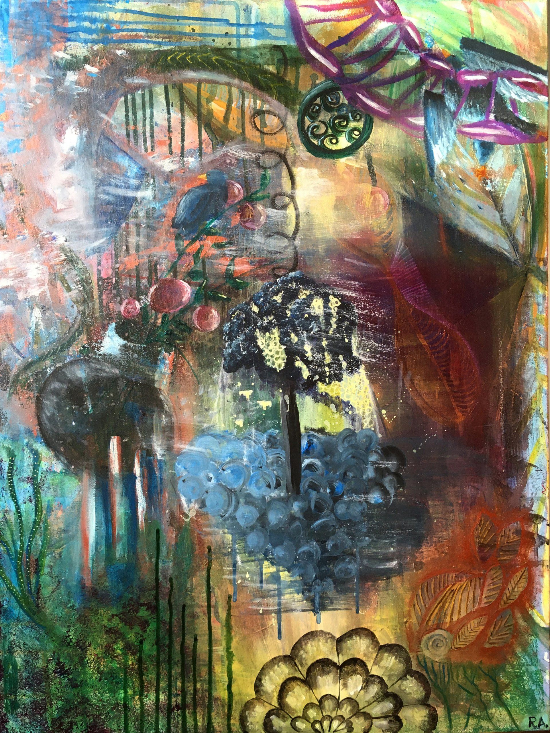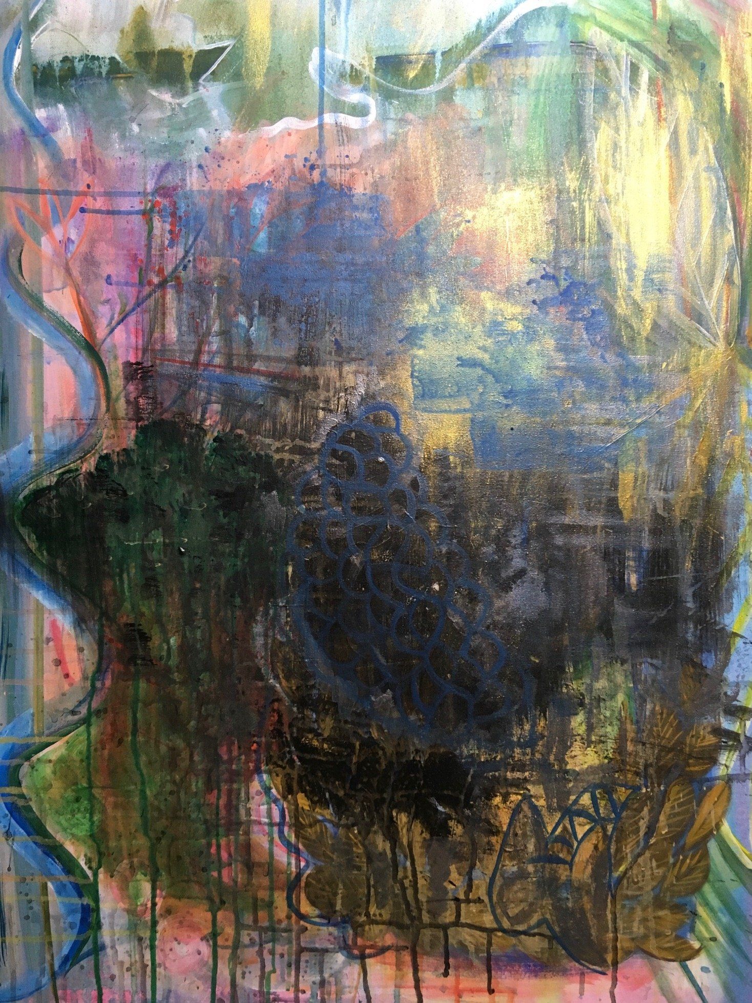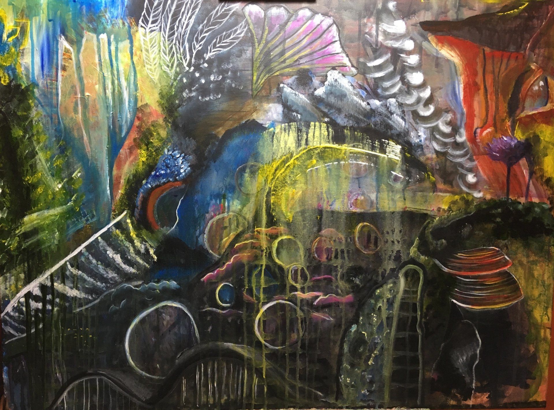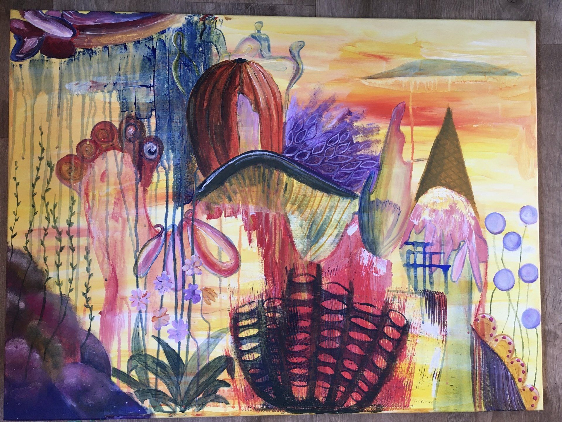 Van 'City drone' heb ik helaas niet veel foto's gemaakt tijdens het proces, omdat ik merk er toch moeite mee te hebben om uit mijn flow te stappen. City Drone is een van mijn eerste intuïtief gemaakte schilderijen op doek met een groter formaat. Ik ben begonnen met het combineren van verschillende technieken en vormen. Het was in een periode van mijn leven waarbij ik opzoek was naar iets nieuws. Ik was nieuwsgierig, enthousiast en vooral veel aan het experimenteren. Toen ik klaar was met het schilderij, deed het mij denken aan een mysterieuze buitenaardse stad, welke in harmonie is met de natuur. Dit is terug te zien aan de paddenstoelen, struiken, bladeren en schelp-achtige vormen. Ik zie een enorme rijkheid in dit mysterieuze landschap en voor het eerst ontdekte ik mijn eigen diepgang.