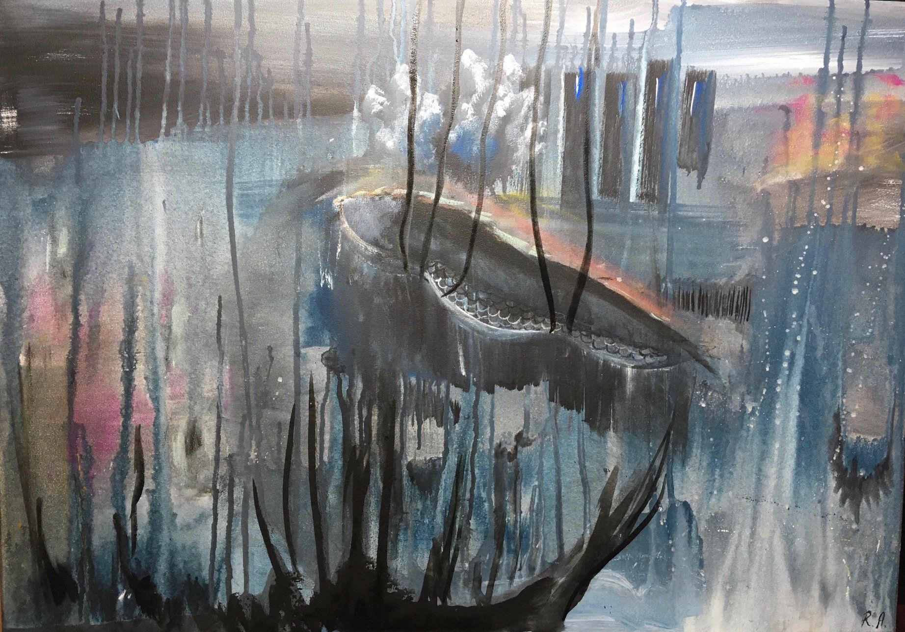 Dit werk heb ik gemaakt toen mijn leven weer even gehuld was in duisternis. Ik was afgewezen door een persoon waar ik verliefd op was en begreep er niks van. Om mij even op iets anders dan de pijn te richten ben ik gaan schilderen. Ik zag alleen maar zwart voor me en ben ook met die kleur begonnen. Langzamerhand zag ik een beeld in de duisternis welke ik steeds meer naar de oppervlakte probeerde te halen. Ik accentueerde de lijnen door verschillende kleuren en wit toe te voegen. Het leek wel alsof het licht erdoorheen probeerde te komen en zelfs gebroken werd, waardoor het uitviel in alle verschillende kleuren. Uiteindelijk lijkt het een vis, die wordt vastgehouden met dunne draden om te voorkomen dat het in stekelige waterplanten valt.